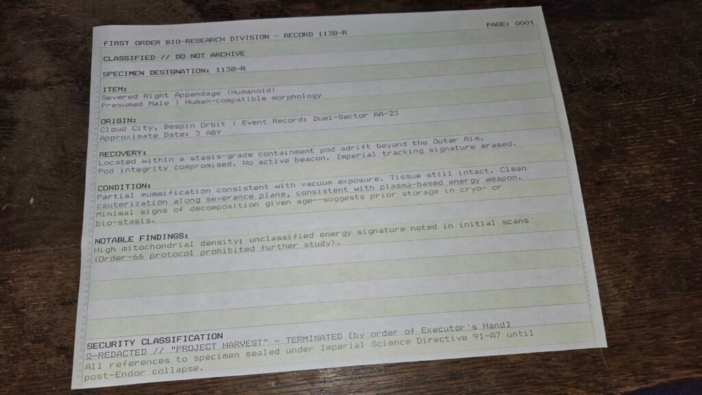I built upon that lore and beefed it up…then I created a physical vacuum chamber containing the partially-preserved remains of Luke Skywalker’s severed right hand.