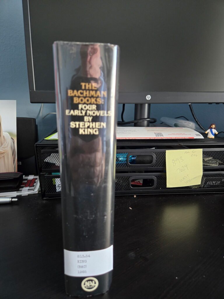 The vague reflection of the person you see in this photo is my dad, who was recently reunited with a copy of The Bachman Books…though this copy is a bit more interesting.